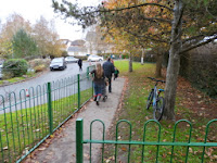 We also observe how there is no car parking space on the school grounds, not even for staff. Those who wish to drive to the school, even for work, have to park their car in parking bays on a residential road nearby. Two wide walk ways provide access to the school grounds and that is it. The design of the school grounds has a strong visual message; walkers and cyclists welcome!