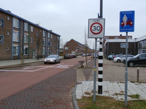 * On any other road, where there is no cycle path available, the road will be traffic-calmed, with limited speeds and sometimes cycle lanes in Dutch styles as pictured on the left.